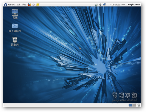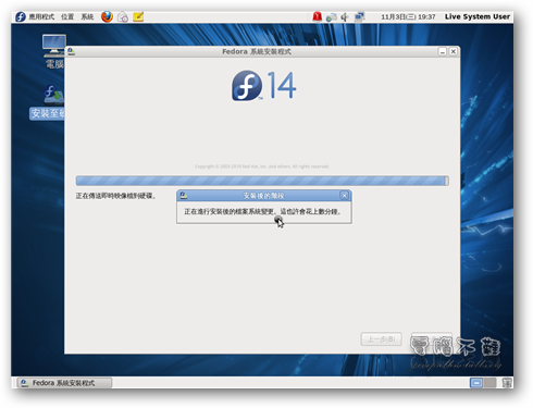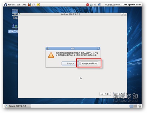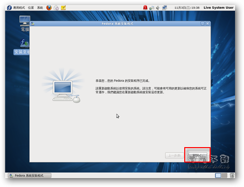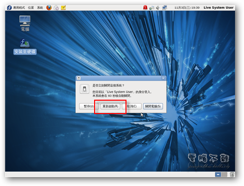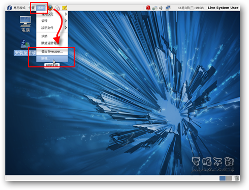 步驟二十 回到Fedora Live CD桌面,按下上方選單的「系統->關機…」。