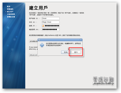 若密碼太簡單,可能會出現如下的提示訊息。按「是」繼續使用。