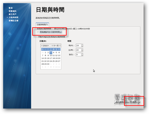 步驟二十六 設定日期,現在網路普及,建議使用網路同步。按「下一步」。