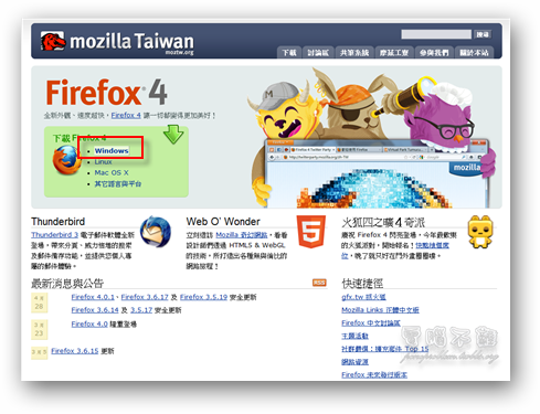 利用上面的連結進入Firefox的官方網站,在「下載Firefox 4」的綠色區塊中按下自己所使用的作業系統平台,即可開始下載。