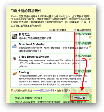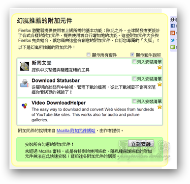 想要安裝我推薦的火狐擴充套件,先連結上面「抓火狐」的網址。進入頁面後即可看到「幻嵐推薦的附加元件」區塊。只要勾選想要安裝的套件,再按下「立刻安裝」即可開始進行下載安裝。