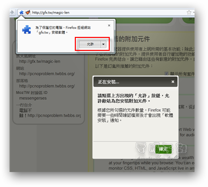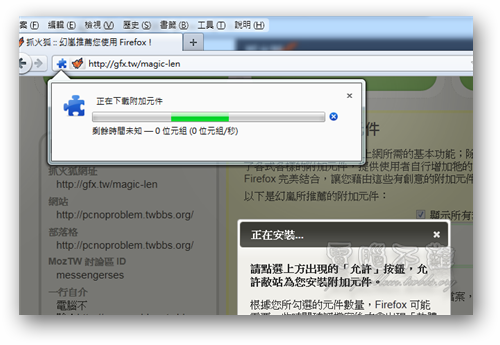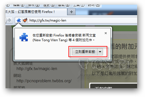 安裝完擴充套件後,需重新啟動Firefox,才能正常使用。