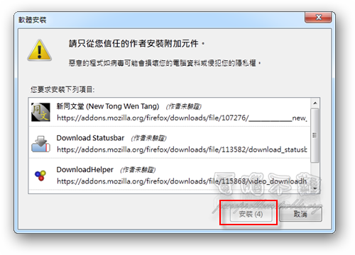 出現將要安裝的擴充套件清單,等待「安裝」按鈕倒數完後按下去便可以開始安裝。