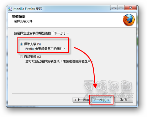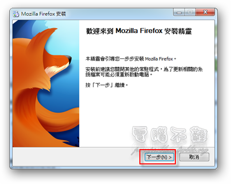 按照上面的方式將Firefox的安裝檔下載回來後,開啟它。接著出現歡迎畫面,按「下一步」繼續。