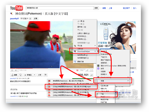 Video DownloadHelper可以協助使用者直接把Firefox開啟頁面中的影片給下載下來,最常用的當然就是Youtube了。只要在想要下載影片的頁面中空白的地方按下滑鼠右鍵,找到「DownloadHelper->媒體」,然後選擇要下載的影片,開出子選單按下「下載」,即可開始下載。