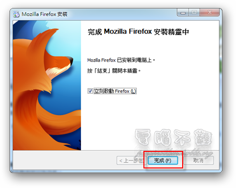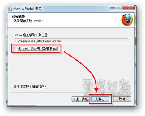 依自己喜好看要不要勾選「將Firefox設為預設瀏覽器」,按下一步繼續。