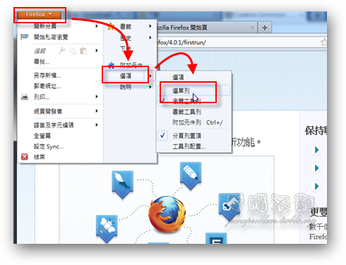 下圖是Firefox 4的畫面,如果不習慣傳統的選單列整個被收合到左上角的橘色方塊,可以照著以下方法進行設定。
