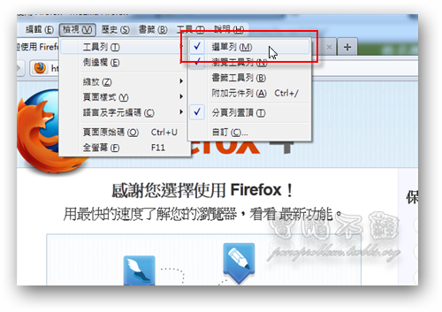 設定方法有兩種,第一種是直接在分頁標籤旁的區塊按下右鍵,將「選單列」打勾。如果你找不到我說的地方在哪裡,也可以用滑鼠左鍵按下左上方橘色的Firefox區塊,會出現功能表選單,找到「選項」,進入子選單,將「選單列」打勾。