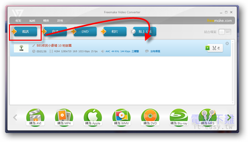 若要將要進行轉檔的影片加入Freemake Video Converter中,可以按下介面左上角的「視訊」按鈕。加入後,影片名稱和簡易的資訊會顯示在清單中。