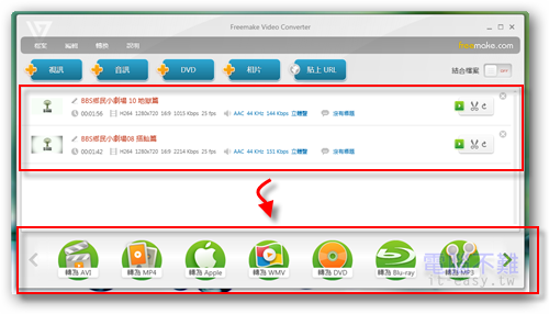 將想要轉檔的影片全部都加入至Freemake Video Converter後,就可以從下方的圖示中,選擇一個想要將影片轉換成的格式。