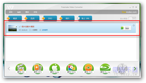 Freemake Video Converter還有個不錯的功能,它能將一張張相片製作成投影片,使用者也可以自行加入音訊至投影片中。