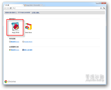 安裝完Angry Birds的應用程式後,會在Google Chrome的新分頁建立一個應用程式捷徑,以便於使用者能直接連到Angry Birds網頁版。