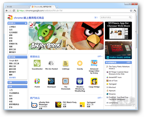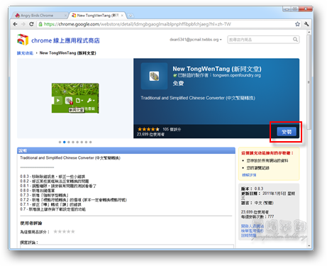 拿現在很夯的Angry Birds來舉例,只要在想要安裝的應用程式或是擴充功能頁面,按下「安裝」,網頁可能會要求你登入Google帳號,登入後即可正常下載安裝。