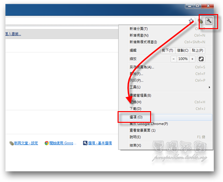 剛安裝完Google Chrome,沒有心理準備者,可能會被它簡潔的介面給嚇到了。「這啥鬼瀏覽器,什麼功能也沒有!」這句話或許是剛接觸到Google Chrome的使用者都會想說的。事實上,Google Chrome的進階功能都藏在右上角的板手圖示下。如果你不習慣Google Chrome介面中少得可憐的按鈕,我會建議你到板手圖示下的「選項」,來進行設定。