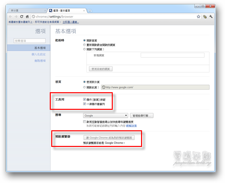 在「基本選項」中,可以設定Google Chrome的起始畫面和首頁。工具列的部分我會習慣將「顯示『首頁』按鈕」和「一律顯示書籤列」給打勾,而且會讓Google Chrome成為我的「預設瀏覽器」,這樣開啟網址連結的速度才會快。