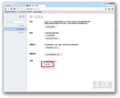 如果你覺得Google Chrome預設的藍色介面不好看,太單調。Google Chrome還提供了多種樣式主題可供選擇。只要按下右上方的板手圖示,進入「選項」設定頁。找到「個人化設定」子標籤頁,會看到「主題」項目,按下「下載主題」,即可連結到Google提供的Chrome主題下載頁。