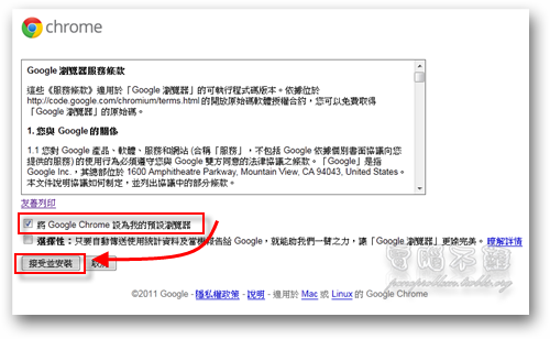 接著依照喜好勾選設定是否要將Google Chrome設為預設瀏覽器,然後按下「接受並安裝」開始下載。