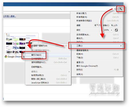 不只是Firefox有附加元件的功能,Google Chrome也是有的!在Google Chrome介面的右上角有個板手圖示,點下去出現功能表選單,找到「工具→擴充功能」。