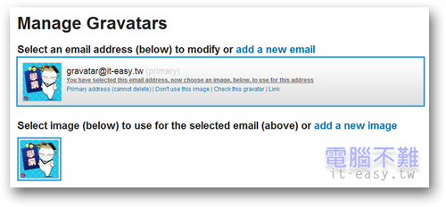 Gravatar方便的地方除了能以跨平台的方式用E-mail顯示大頭貼外,只要擁有一組Gravatar帳號,就可以設定多個E-mail和不同的大頭貼圖像。避免一組帳號只能用一個E-mail,若有多個E-mail還要申請多組帳號的麻煩。