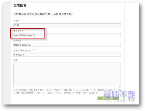前面提到過Gravatar是使用E-mail來套用個人大頭貼,也就是說使用者必須在留言時填入正確的E-mail,才能顯示出正確的大頭貼。