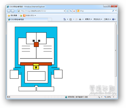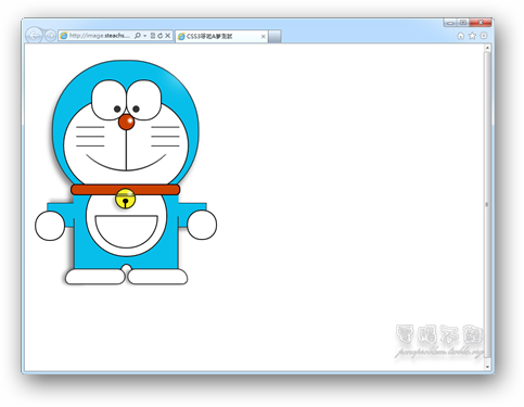 上圖所瀏覽的網頁是由某CSS高手基於CSS3技術所畫出來的哆啦A夢,你以為這樣方方正正的樣子就是它原本的面貌嗎?怎麼可能!來看看這個網頁在IE9下是什麼樣子吧!