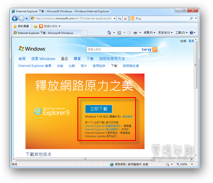 如果你是使用Windows Vista以上版本的作業系統,那麼點選下面的連結,就可以看到IE9的下載點,否則為IE8。