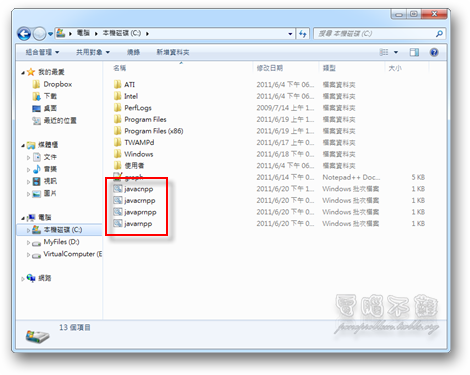 步驟一 利用上面的下載任何一個下載連結,將「javanpp.zip」下載下來。然後將其解壓縮到「C:」磁碟機的根目錄下。當然也不一定要放在「C:」,其他目錄也可以,不過為了方便設定,還是放在「C:」吧!解壓縮出來有四個檔案,分別是javacnpp.bat, javacrnpp.bat, javaprnpp.bat, jabarnpp.bat。後面會一一帶出這四個批次檔案的功用。
