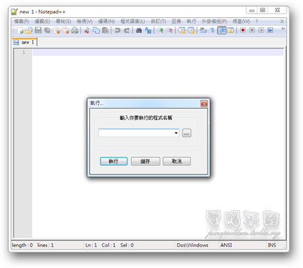 步驟二 在Notepad++中,按下鍵盤上的「F5」快速鍵,開啟Notepad++內建的「執行指令」功能視窗。