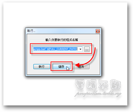 在Notepad++的「執行」視窗的「程式名稱」中,輸入指令,接著按下「儲存」。在新增快速鍵視窗中輸入快速鍵的名稱和快速鍵的組合方式。設定完成後按下「OK」。