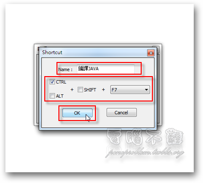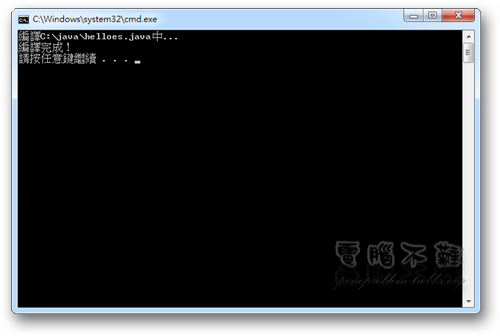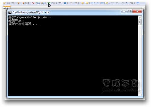 按下鍵盤上的編譯Java程式的快速組合鍵,如我你用跟我一樣的設定,那麼按Ctrl+F7後,即可呼叫CMD進行編譯Java的動作。