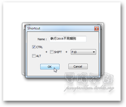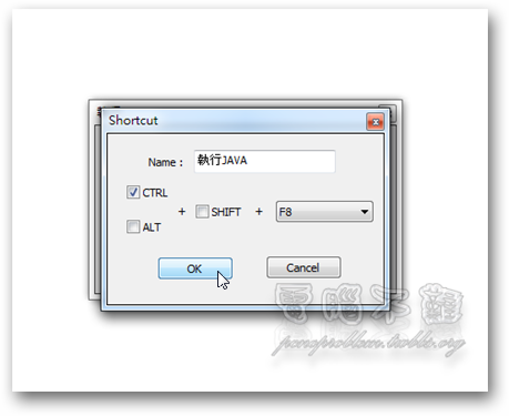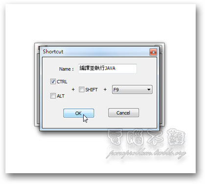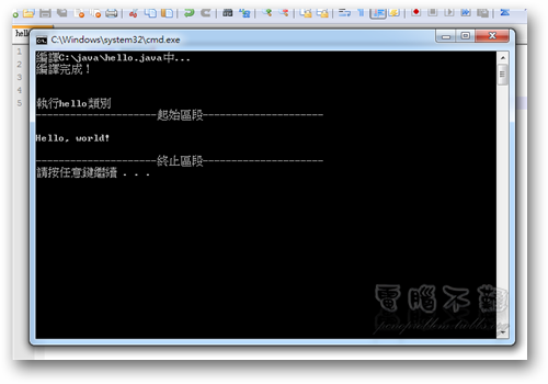 按下鍵盤上的編譯並執行Java程式的快速組合鍵,如我你用跟我一樣的設定,那麼按Ctrl+F9後,即可呼叫CMD,在編譯目前的.java檔案後,立即執行它的同名Class。
