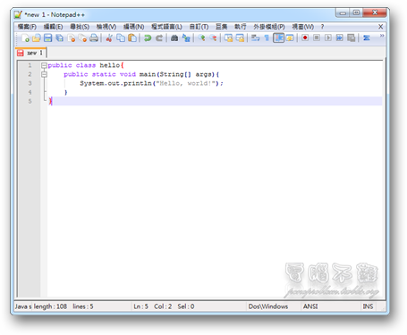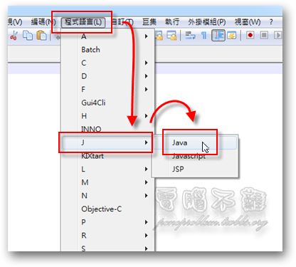 Notepad++上的Java環境設定完成後,寫個簡單的單純輸出文字的程式來測試看看吧!在Notepad++上寫Java程式之前,先設定好Notepad++要使用的「程式語言」。在Notepad++介面中,按下上方選單列的「程式語言->J->Java」,即可完成選擇。