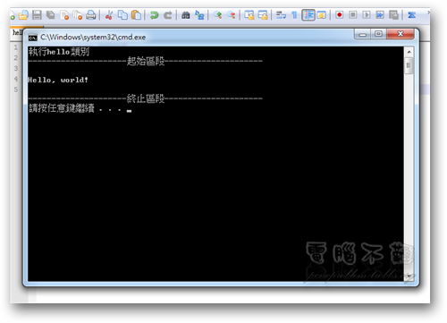 按下鍵盤上的執行Java程式的快速組合鍵,如我你用跟我一樣的設定,那麼按Ctrl+F8後,即可呼叫CMD執行剛才成功編譯的Java Class。