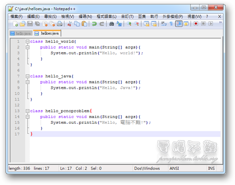 有時候我們可能會在一個.java內撰寫很多類別(Class),若沒有用public進行宣告,那麼編譯後產生出來的.class檔案不一定跟.java的檔案名稱一樣,如果使用javacrnpp.bat或是javarnpp.bat去執行會有問題出現。如果真的不幸需要編譯此種.java檔案,那麼需先用javacnpp.bat進行編譯後,再用javaprnpp.bat來針對不同class名稱做執行。假設我們已寫好如同以下多種class的Java程式。