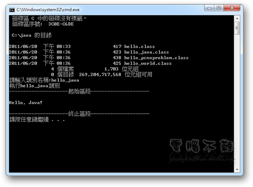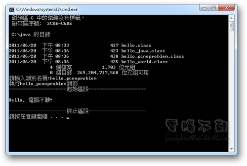 class hello_world{ public static void main(String[] args){ System.out.println("Hello, world!"); } } class hello_java{ public static void main(String[] args){ System.out.println("Hello, Java!"); } } class hello_pcnoproblem{ public static void main(String[] args){ System.out.println("Hello, 電腦不難!"); } } |