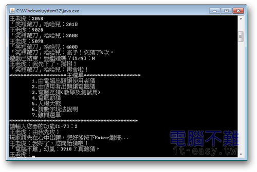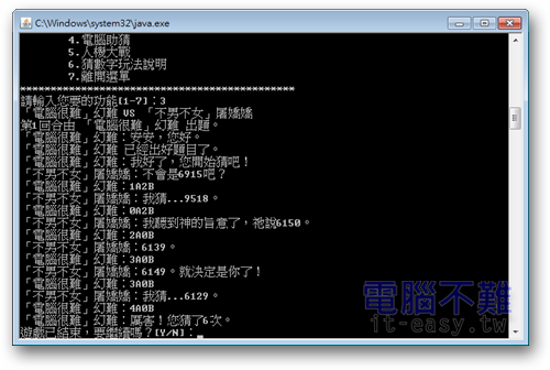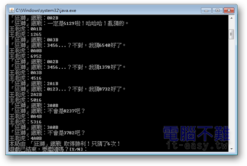 接著會出現遊戲結束的訊息,要求使用者輸入Y或N決定是否要繼續遊戲。