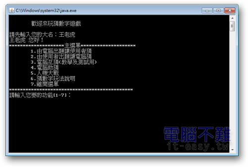 輸入名稱後會出現遊戲主選單,一共有七項。可以輸入半形數字來選擇使用。