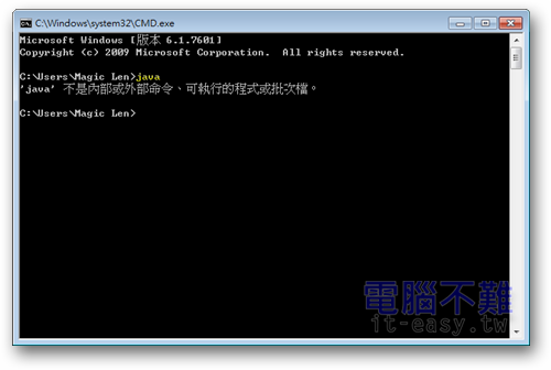 在命令提示字元或是終端機中輸入並執行「java」指令。若沒有出現一大串英文字,則表示系統內並無Java執行環境。