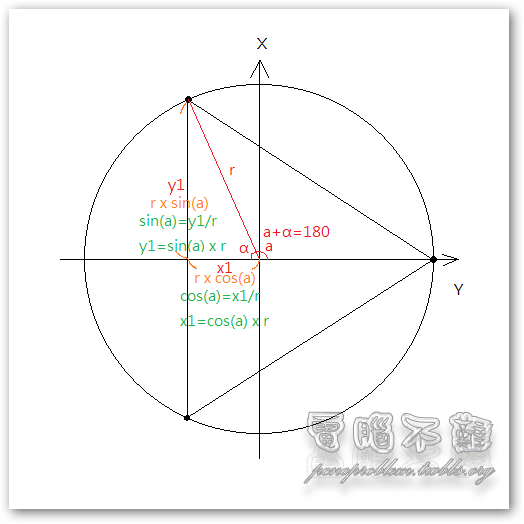 一個圓有2π,若要在半徑為r的圓內繪製出一個正三角形,就必須把2π再除以3,將一個圓的角度三等分,最後利用sin、cos來求得x與y座標。如上圖所示,我們定義sin(α)為對邊除以斜邊(y1/r);cos(α)為臨邊除以斜邊(x1/r),但由於α位於第二象限,因此要為-cos(α)。為了避免象限的混淆,一律用a角度(從0度算起)來做為三角函數的角度。若要求出頂點的x值,可以利用cos(a)的值去乘以斜邊,即先鄰邊除以斜邊,再乘以斜邊,如此得到的值為鄰邊,也就是x1之值。若要求出頂點的y值,可以利用sin(a)的值去乘以斜邊,即先對邊除以斜邊,再乘以斜邊,如此得到的值為對邊,也就是y1之值。另一種較快速說法,cos和sin函數值(鄰邊及對邊)是建立在斜邊為1之下的比值,也就是說,如果要代入自己想要的邊長,只要再乘斜邊長的就可以了(因為等比例)。至於原點,我們假設是(0,0)好了,若要偏移,則可利用加減的方式來移動。綜合以上,我們可以導出下面公式: