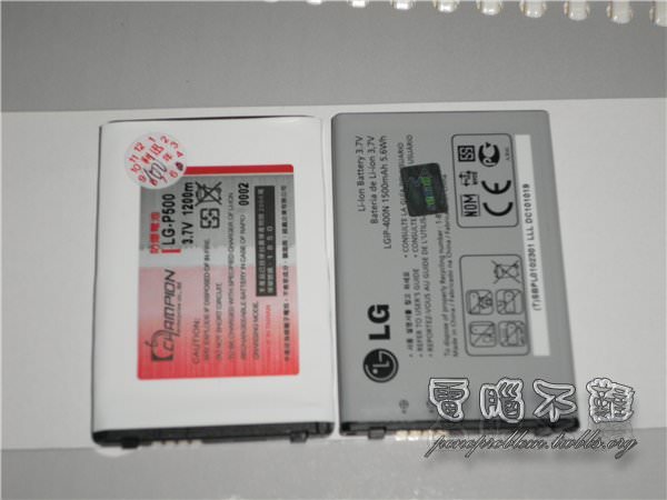 副廠電池與原廠電池合照。原廠電池容量有1500mAh,比副廠的1200mAh還大。