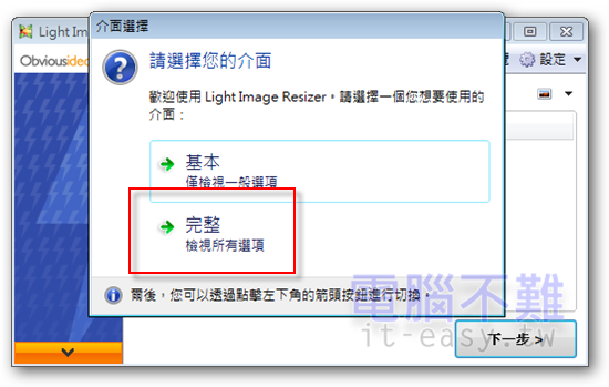 如果是第一次執行Light Image Resizer,程式會要使用者選擇要使用的介面。建議選擇「完整」,才有很多項目可以設定。