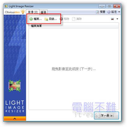 想要將要處理的圖片加入Light Image Resizer中,可以直接將檔案拖曳進檔案清單中,或是按下「檔案…」或「目錄…」按鈕。