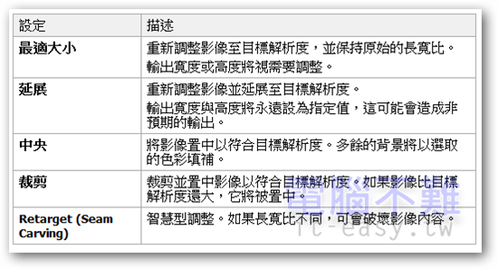 Light Image Resizer有個十分貼心的設計,就是它提供了某些較難理解的設定項目說明。例如調整圖片尺寸的「模式」,分為「最適大小」、「延展」、「中央」、「裁剪」。使用者在設定的時候很難從字面上判斷這些設定值的具體作用,Light Image Resizer會在旁邊跳出更詳細的說明視窗。