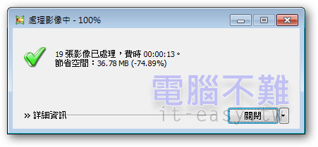 圖片處理完成後除了會顯示使用的時間外,還會計算轉換後跟轉壞前的所需空間差距,讓使用者知道自己節省了多少空間,真的很貼心啊!