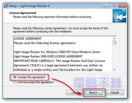 步驟三 授權條款部分,選擇「I accept the agreement」,按下「Next >」繼續。