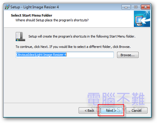 步驟五 自訂開始功能表的位置,按下「Next >」繼續。