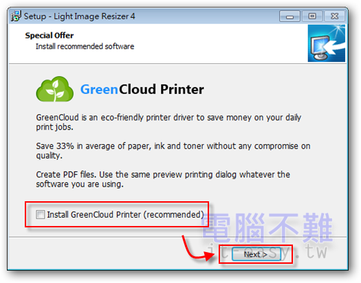 步驟八 安裝後安裝程式會詢問是否還要裝其他的軟體。照自己喜好勾選後,按下「Next >」繼續。