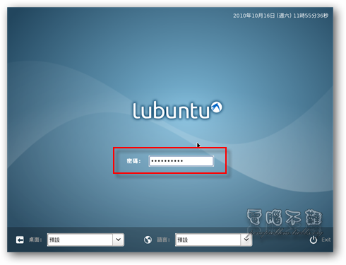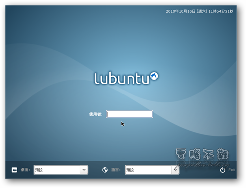 安裝完Lubuntu後,重開機,記得把光碟拿出來,若您沒有設定自動登入,那麼就會看到登入畫面。在Ubuntu和其眾多分支中,我最喜歡的就是Lubuntu的登入畫面。