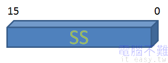 SS用來存放堆疊的位址。若配合SP(SS:SP)使用,可以得到堆疊內存放資料的實際位址。有關堆疊的觀念會在之後的章節做介紹。