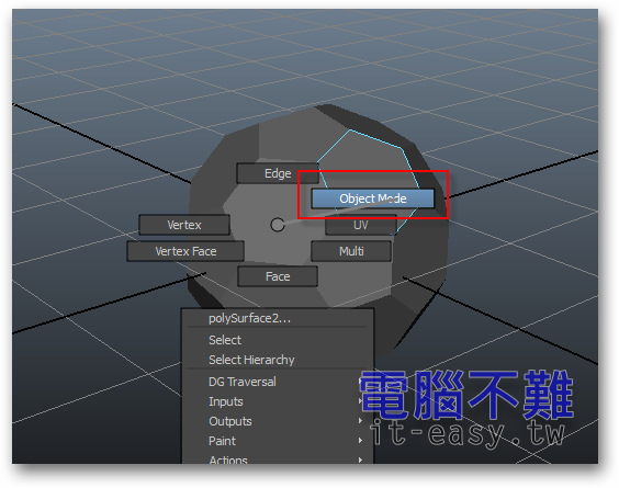 第7步 確認所有的面都獨自分離後,在Soccer Ball上按住滑鼠右鍵,拖曳到「Object(物件) Mode」的地方,回到物件選取模式。